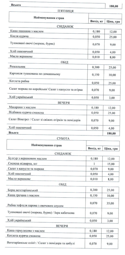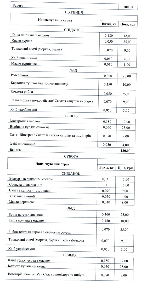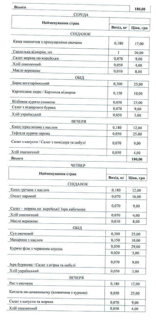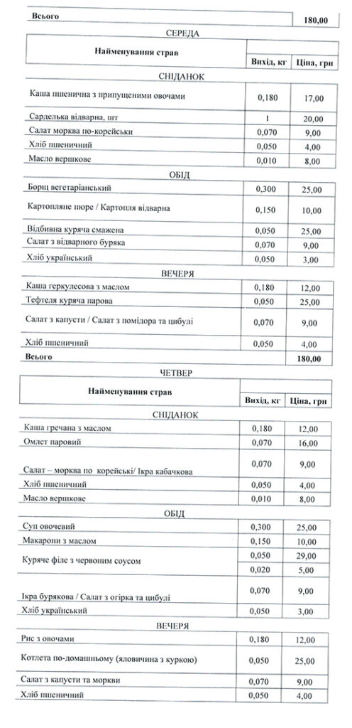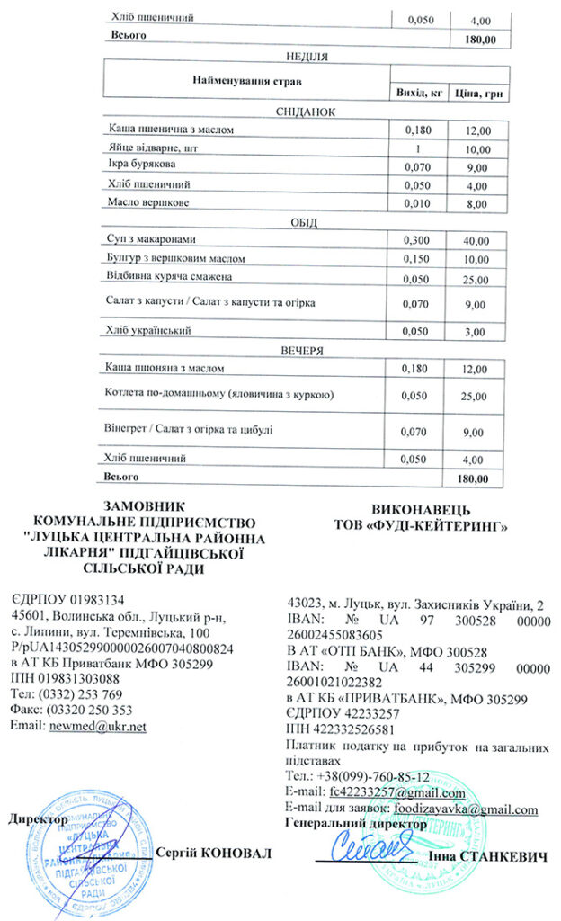 Наприклад, у понеділок пацієнти Луцької центральної районної лікарні їстимуть на сніданок гречану кашу (12 гривень) із сосискою (15 гривень), а також салат з буряка (9 гривень) та хліб з маслом (4 та 8 гривень). На обід їм привезуть гороховий суп (25 гривень), плов (45 гривень), салат «Вінегрет» (9 гривень) та хліб. А от на вечерю фірма «Фуді-Кейтеринг» приготує для хворих пшеничну кашу (12 гривень), курячу запечену котлету (25 гривень) та, традиційно, додасть скибку хліба. У вівторок у денному меню передбачені і котлета по-домашньому (25 гривень), і булгур з маслом (12 гривень), а також куряча котлета (25 гривень), рибна тефтеля (25 гривень), гречаний суп (25 гривень) тощо.