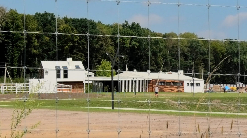 Паркан-сітка веде до розкішної конюшні. З лісу до неї обладнаний в’їзд з воротами.