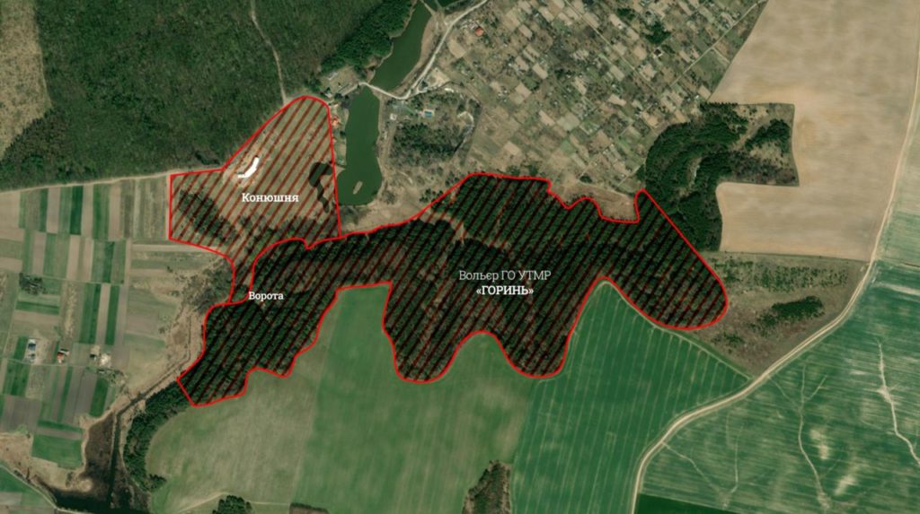 На сітці, якою по периметру загородили ліс, знаходимо інформацію про те, що це вольєр громадської організації «Товариства мисливців і рибалок «Горинь».