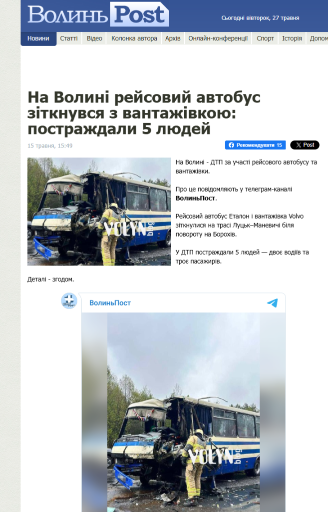 У новині на цьому ж сайті «У Луцьку автокран на переході збив жінку з дитиною. Фото» ситуація з прозорістю виглядає трохи краще («як розповіли Волинським Новинам у пресслужбі ГУНП у Волинській області,…»). Видно, що журналісти звертались по коментар і провели власну роботу. Але водночас, бракує прізвища журналіста чи журналістки, які готували цей матеріал. Це значно б посилило довіру до публікації, як і повагу до редакції.