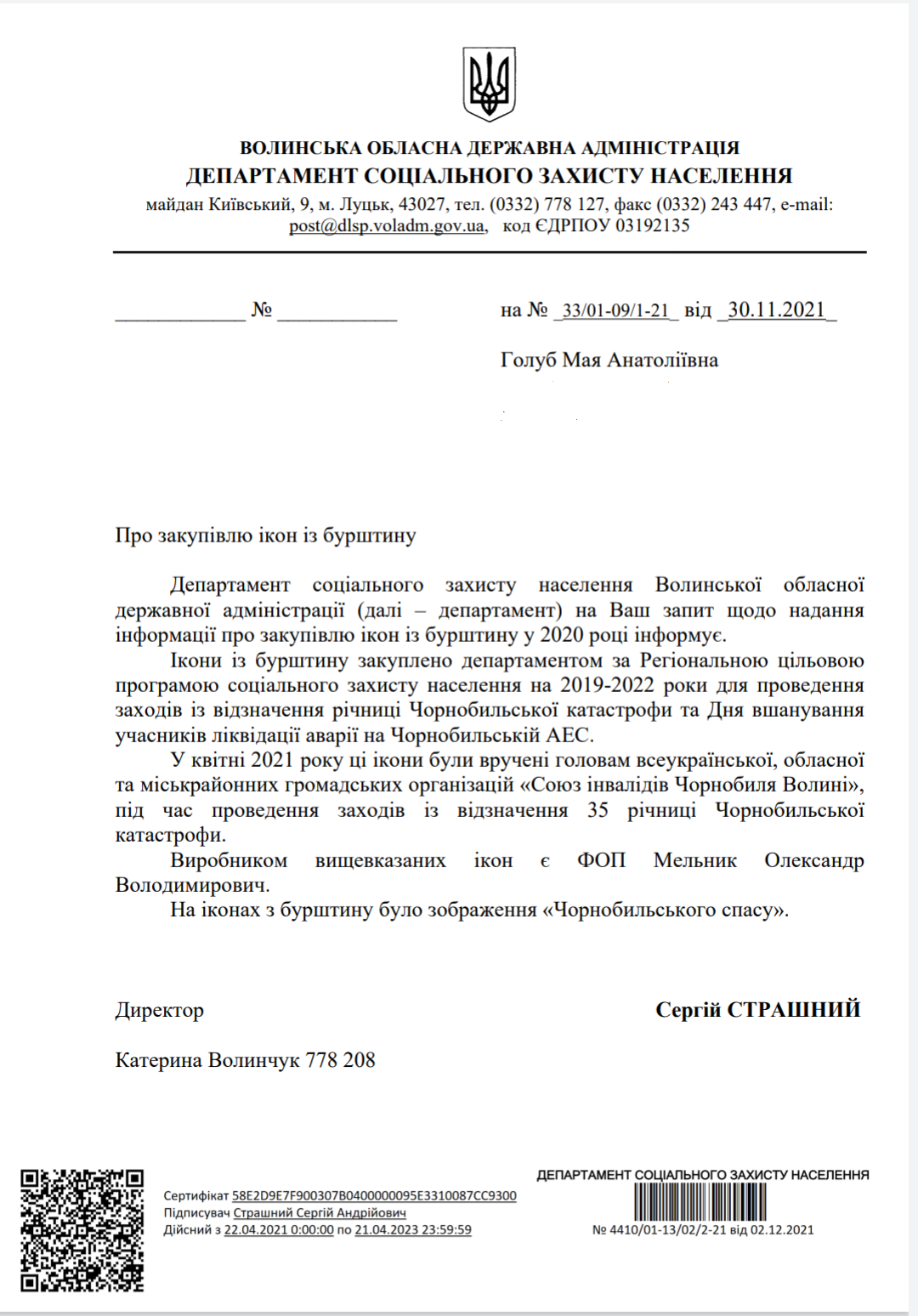 Окрім бурштинових ікон для представників «Союзу інвалідів Чорнобиля Волині», ОДА більше ікон не купляла.