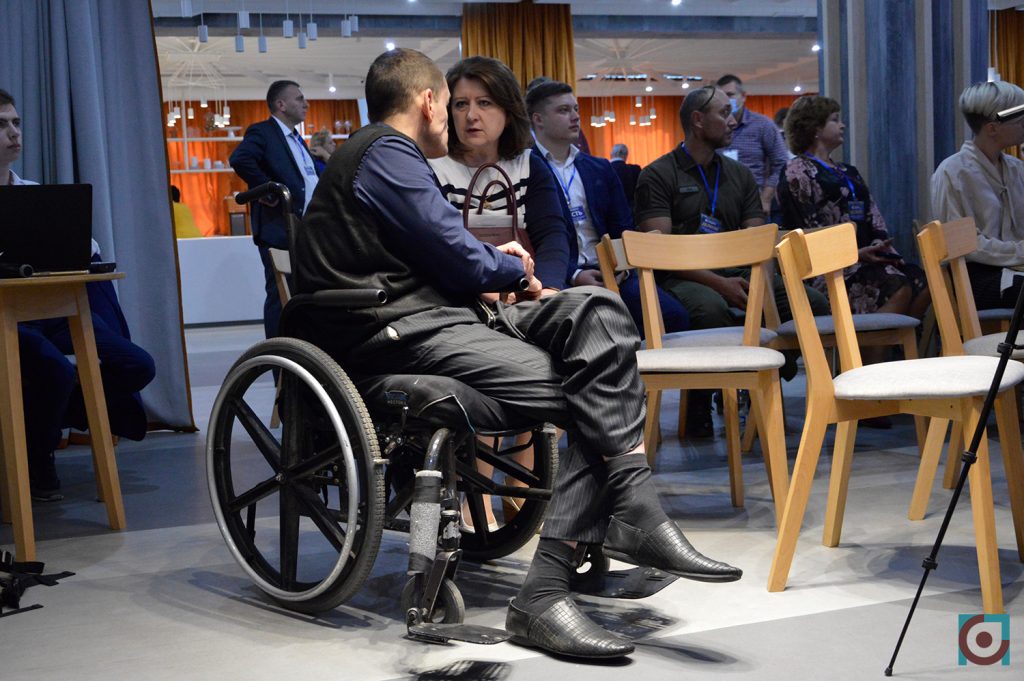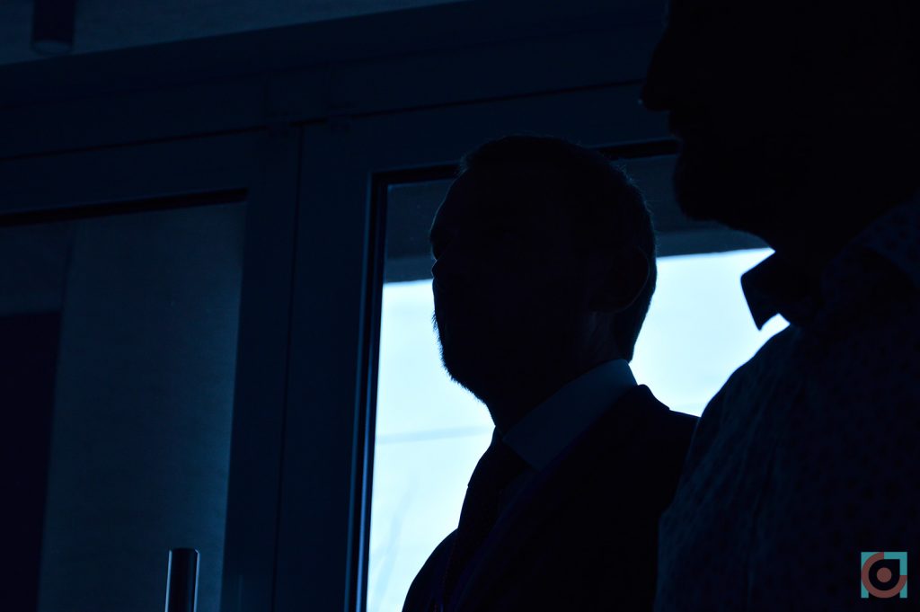 В цей час ведучий, схоже, готується представляти наступних спікерів і пошепки активно дискутує про щось з організаторами.