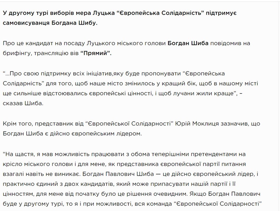 7 листопада на сайті телеканалу «Прямий» з’явилося повідомлення про підтримку Богдана Шиби з боку Луцької міської організації «Європейської Солідарності». У новині вкладене відео із брифінгу кандидата, у котрому беруть участь обрані депутатами Луцької міської ради Юрій Моклиця (котрий також раніше кандидував на посаду міського голови), Олександр Ніколайчук, Валентина Малютіна, Микола Яручик та кандидатка до Волинської обласної ради (№1 у єдиному списку), очільниця обласного осередку партії Юлія Вусенко. Шиба натомість зазначає, що підтримуватиме ініціативи представників «Європейської Солідарності», спрямовані на покращення життя міста.
