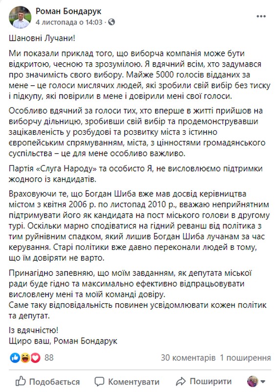 Роман Бондарук («Слуга народу»), котрий не втрапив до другого туру, однак за результатами голосування пройшов у депутати Луцької міської ради, 4 листопада виклав пост, у котрому подякував за віддані за нього голоси. Наприкінці він зазначає, що він особисто та партія не висловлюють підтримки жодному із кандидатів. Однак далі у дописі йдеться, чому він вважає неприпустимою підтримку Богдана Шиби.