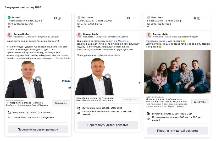 Зауважимо, що згідно із даними Бібліотеки реклами Facebook, із офіційної сторінки кандидата станом на 7 листопада рекламували принаймні 4 дописи про підтримку Богдана Шиби – зокрема, Народним Рухом України (транслювалася до 23 жовтня), Миколою Яручиком, Валентиною Малютіною та Юрієм Моклицею. Оплачував цю рекламу Святослав Лесюк. Кожен із дописів транслювався із застереженням та коштував від 0 до 100 доларів. Окрім того, ще один екскандидат на посаду міського голови висловив свою позицію щодо голосування у другому турі.