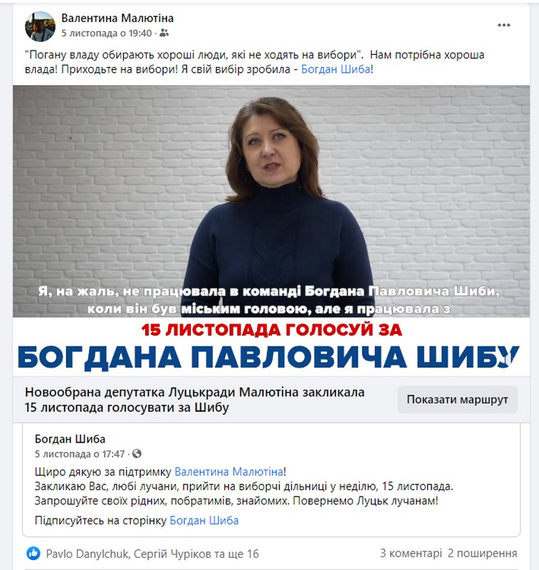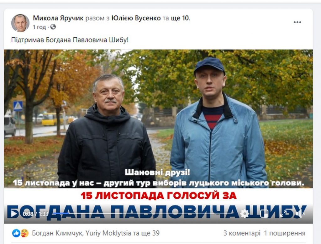 Зауважимо, що напередодні вищевказані новообрані депутати Луцької міської ради Микола Яручик, Валентина Малютіна та Юрій Моклиця записали окремі відеоролики на підтримку Богдана Шиби, у котрих закликають підтримати кандидата під час голосування 15 листопада. У роликах присутнє також гасло, під яким кандидат проводив передвиборчу кампанію.