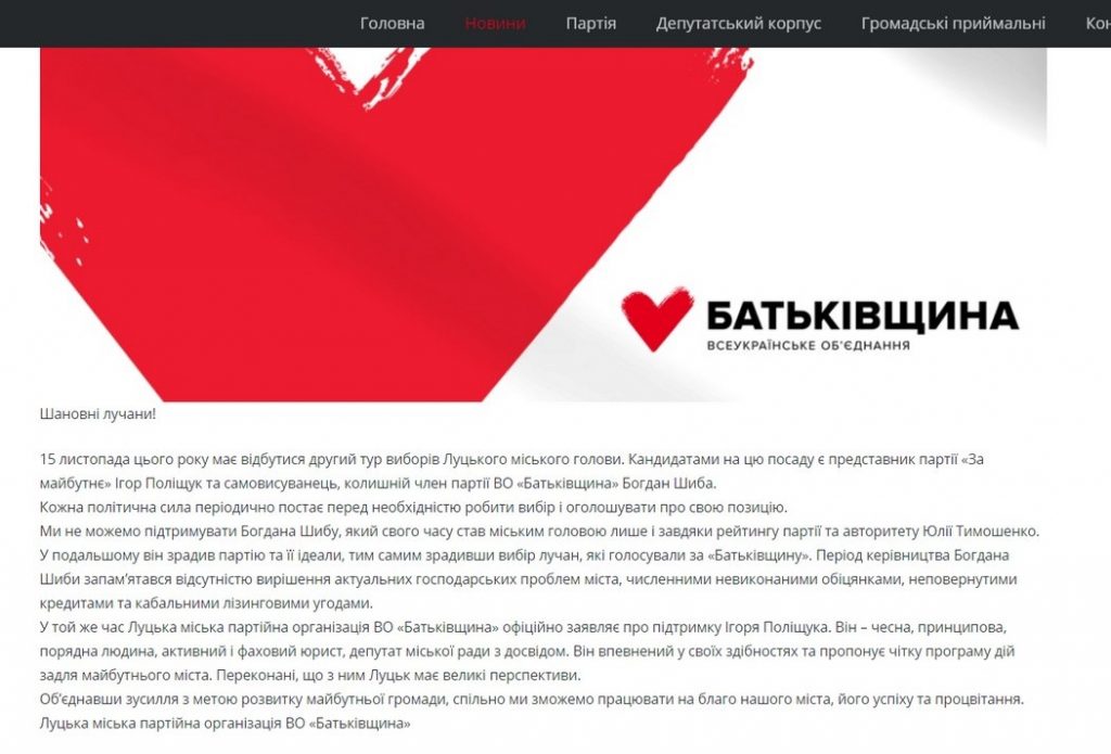 Зокрема, 3 листопада на сайті Волинського осередку ВО «Батьківщина» з’явилася заява Луцької міської парторганізації на підтримку Ігоря Поліщука. У тексті заявляють, що не підтримують Богдана Шибу, згадуючи й про те, що раніше він був членом ВО «Батьківщина». Натомість «офіційно заявляють про підтримку» Ігоря Поліщука, описуючи його особисті якості та посилаючись на перспективи Луцька під його головуванням.
