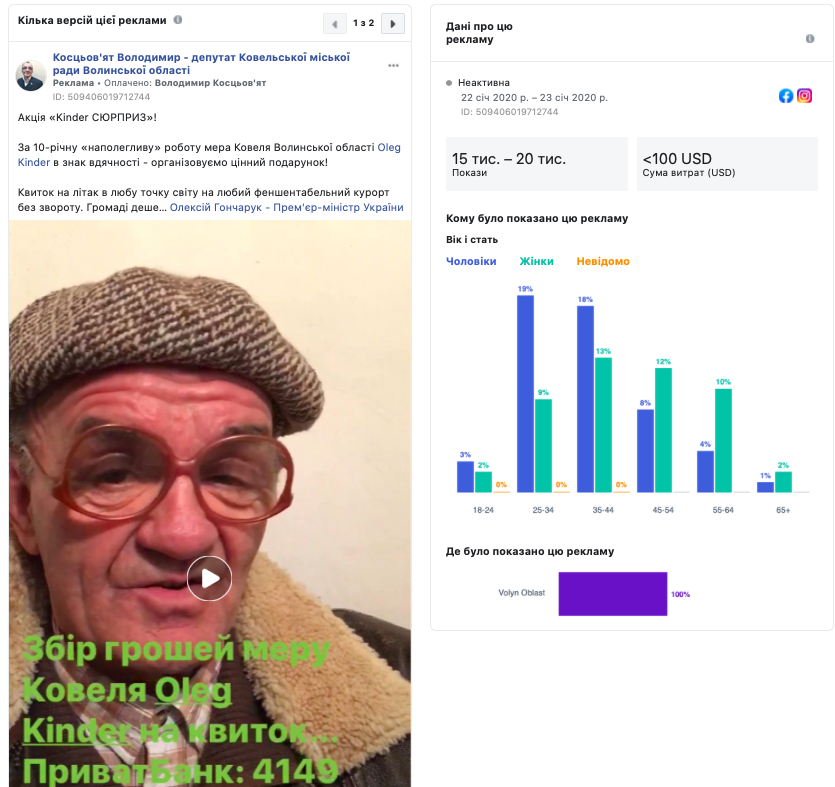 Лідером за кількістю реклами у Facebook на Волині виявилась сторінка «Косцьов’ят Володимир – депутат Ковельської міської ради Волинської області», де протягом перших трьох місяців 2020 року було виявлено 25 рекламних постів, пов’язаних із соціальними питаннями, виборами або політикою. Публічна сторінка належить депутату Ковельської міської ради із фракції «Українське об’єднання патріотів – УКРОП» Володимиру Косцьов’яту. Сторінка була створена 15 січня 2020 року. Усі розміщені матеріали вартували від 0 до 99 американських доларів, а загалом рекламодавець витратив 222 американських долара. Матеріали таргетувались виключно на мешканців Волинської області. Більше половини рекламних матеріалів на цій сторінці стосувалися критики міської влади, зокрема, Ковельського міського голови Олега Кіндера.