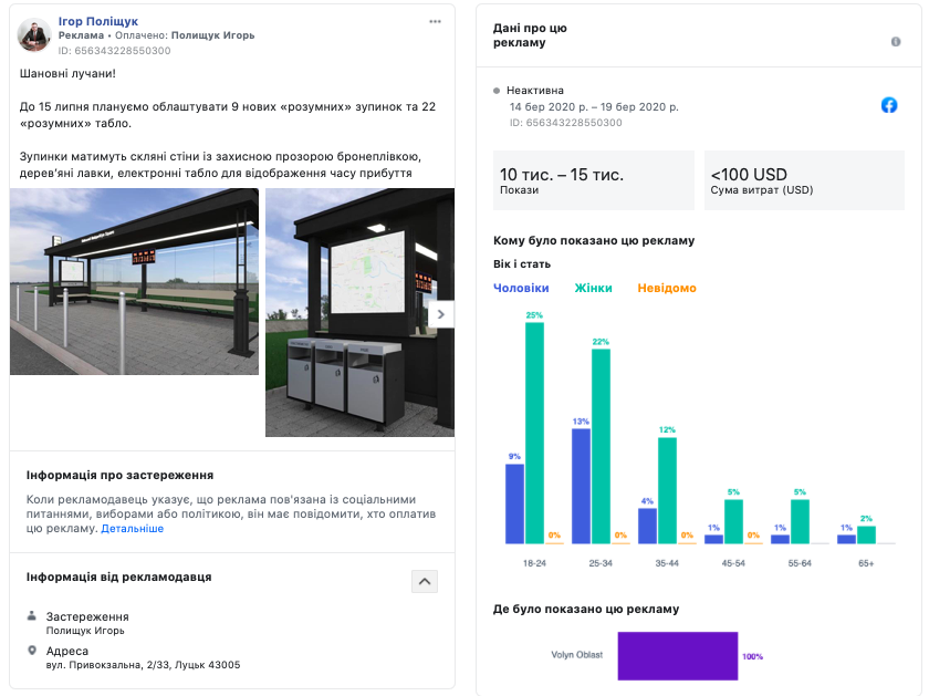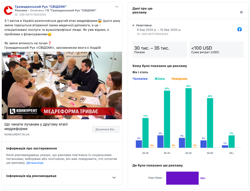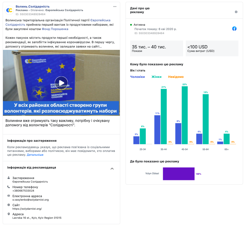 Протягом перших трьох місяців 2020 року у Бібліотеці реклами Facebook виявлено 112 рекламних повідомлень на публічних сторінках волинських політиків, ЗМІ та місцевих громадсько-політичних організацій. Близько 90% виявлених публікацій були позначені як політична реклама і транслювались із застереженням. Разом з тим, більше 95% рекламних постів таргетувались виключно на жителів Волинської області.