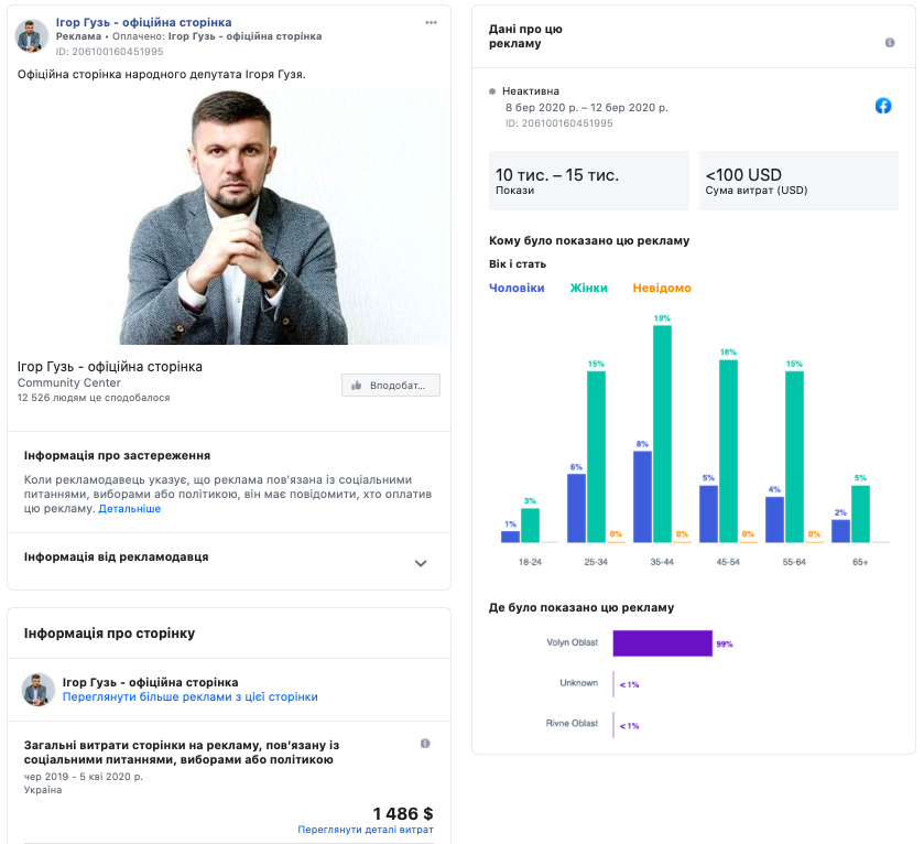 11 рекламних повідомлень було зафіксовано на сторінці у Facebook «Ігор Гузь – офіційна сторінка», яка належить народному депутату України, члену депутатської групи «За майбутнє» Ігорю Гузю. На кожен з опублікованих матеріалів рекламодавець витратив від 0 до 100 американських доларів. Загальна вартість витрат сторінки наразі становить 1486 американських доларів. Реклама таргетувалась переважно на мешканців Волинської області, а рекламувалась переважно виступи народного депутата у Раді, виконання інфраструктурних робіт «за сприяння» нардепа у виборчому окрузі №19, де він був обраний, а також безпосередньо сторінка народного депутата Ігоря Гузя.