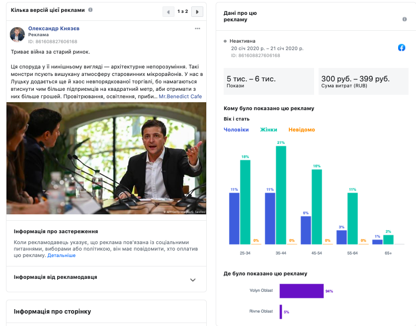 Одна з таких сторінок – «Олександр Князєв». У 2020 році на цій сторінці було виявлено дві версії реклами із заголовком «Триває суперечка за Старий ринок». Реклама була таргетована переважно на мешканців Волинської та частково Рівненської області. Опублікована реклама була оплачена російськими рублями. Перший рекламний пост вартував від 300 до 400 RUB (5-6 тис. показів), другий – від 100 до 200 RUB (100 показів).