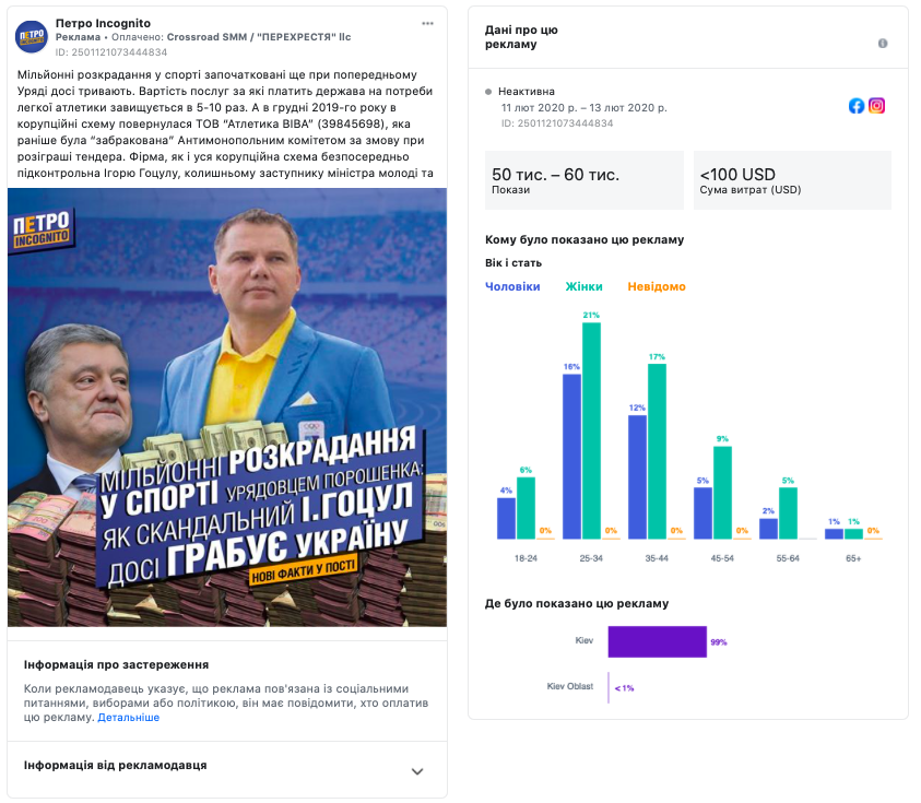 Ще одна сторінка у Facebook – «Петро Incognito». Протягом 2020 року тут було зафіксовано два пости, позначені як звичайна реклама і вартували рекламодавцю від 0 до 100 американських доларів. Оскільки публікації стосувались суспільно-політичної тематики, вони були пізніше ідентифіковані як політична реклама, і адміністрація Facebook після цього припинила їх трансляцію. В обох матеріалах описується схема «відмивання» державних коштів у галузі спорту на прикладі проведення змагань з легкої атлетики на стадіоні «Авангард» у Луцьку. Тут також йдеться, що на оренду стадіону для проведення чотириденних змагань у липні 2019 року з бюджету було витрачено більше 3 млн грн, в той час як реальна орендна плата стадіону на один день становить 250 тис. грн.