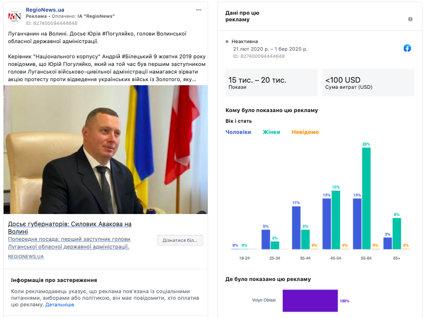 Третя виявлена сторінка із політичної рекламою – «RegioNews.ua». Два поширені тут матеріали вартістю від 0 до 100 американських доларів були таргетовані переважно на Волинську область. Перший рекламний пост стосувався голови Волинської обласної державної адміністрації Юрія Погуляйка. Другий матеріал – відсутності у Луцьку міського голови і можливих кандидатів на цю посаду на місцевих виборах 2020 року.