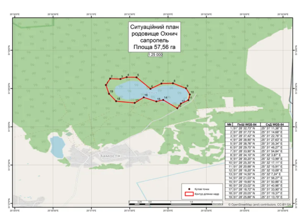 Підприємство «Волиньторф» придбало дозвіл на розробку родовища Охнич у Камінь-Каширському районі, поблизу села Замостя. Ціна продажу стартувала з 216 тисяч гривень, а в результаті аукціону зросла до 701 тисячі. За освоєння цього родовища конкурували три компанії: «Сивий потік», «Зелена неділя» та «Волиньторф», який отримав перемогу і наступні 20 років видобуватиме тут сапропель.