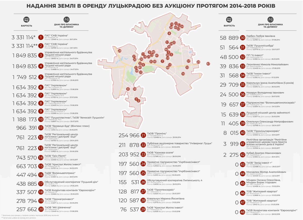 З 2014 до 2018 року (березень включно) Луцька міська рада надала 44 земельні ділянки без проведення аукціонів для будівництва і обслуговування багатоквартирних житлових будинків та для будівництва і обслуговування будівель ринкової інфраструктури. І жодної такої ділянки не було передано через аукціон.