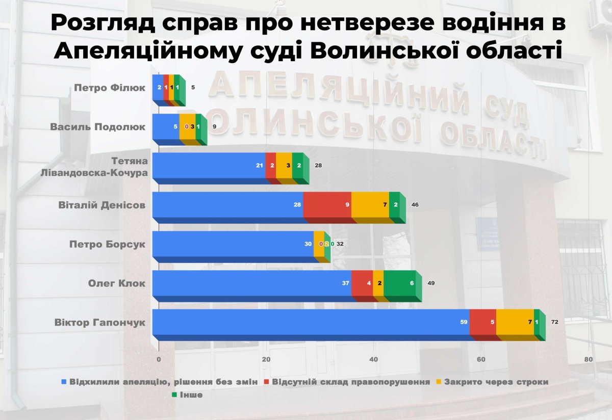 У 2018-му році Апеляційний суд Волині розглянув 241 скаргу на рішення судів першої інстанції щодо нетверезих водіїв, тобто за 130 статтею Кодексу України про адміністративні правопорушення.