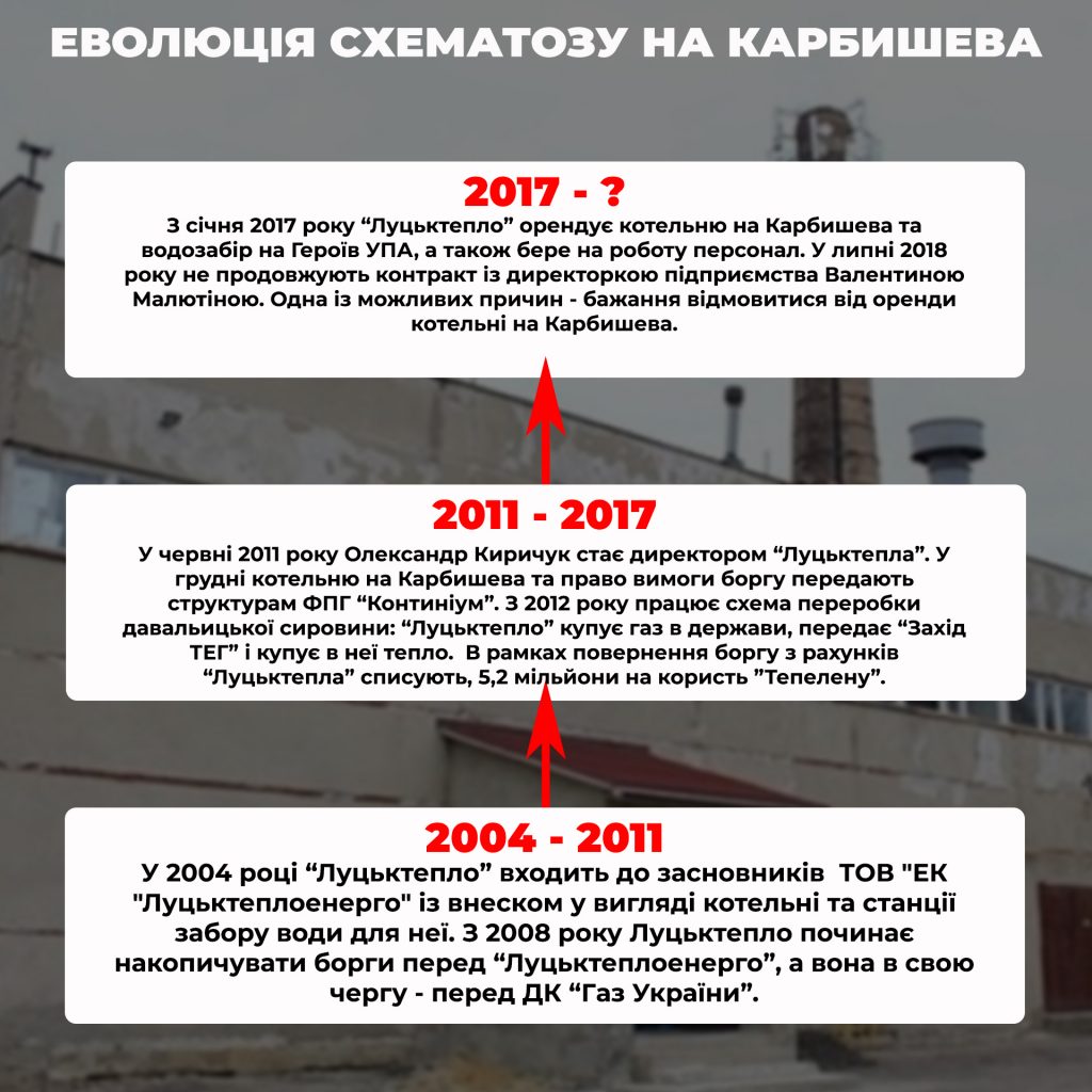 Історія «приватизації» цієї котельні розпочалася у 2004 році, коли Луцька міська рада з головою Антоном Кривицьким дозволила ДКП «Луцьктепло» увійти до переліку учасників ТОВ «ЕК «Луцьктеплоенерго». Щоб стати співзасновником нового підприємства, «Луцьктепло» по суті внесло в його статутний капітал цю котельню і станцію забору води для неї. За даними YouControl, Іншу частину вніс бізнесмен Олександр Кропива, який також входить до засновників ПРАТ «Волинський шовковий комбінат», колись великого підприємства, яка також зареєстроване на Карбишева,2.