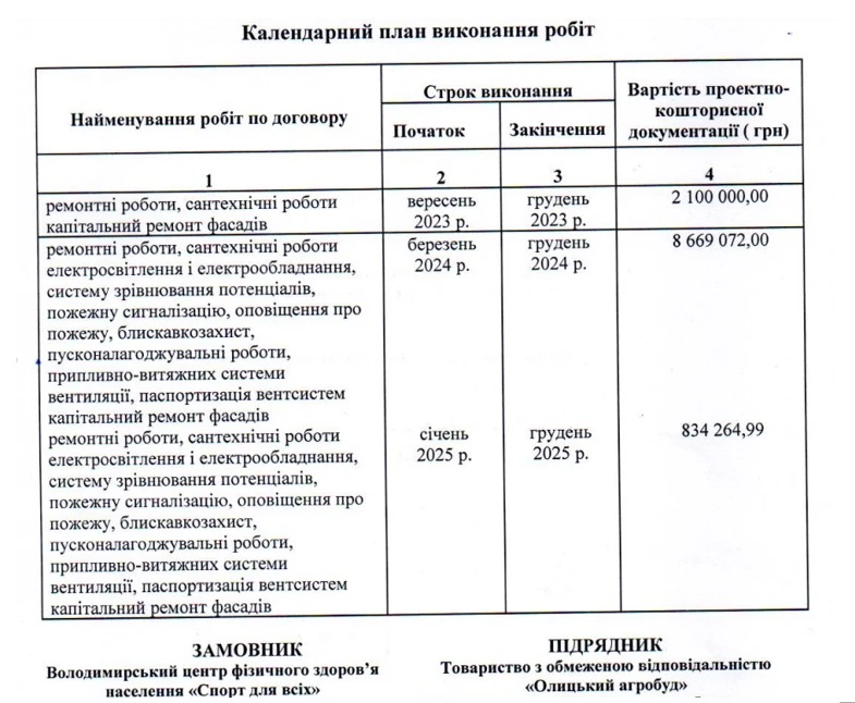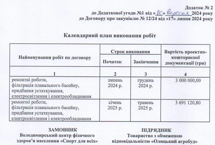 За основним договором від 28 вересня 2023-го, замовник за 13,4 мільйона гривень з місцевого бюджету запланував у басейні різноманітні будівельні, ремонтні та сантехнічні роботи, ремонт електро- та вентиляційного обладнання, встановлення пожежної сигналізації, блискавкозахист, пусконалагоджувальні роботи тощо. Капремонт згідно з планом мали завершити до кінця 2024 року. Однак торік у грудні ціну й терміни скоригували: ремонт подешевшав до 11,6 мільйона гривень і його продовжили на рік.
