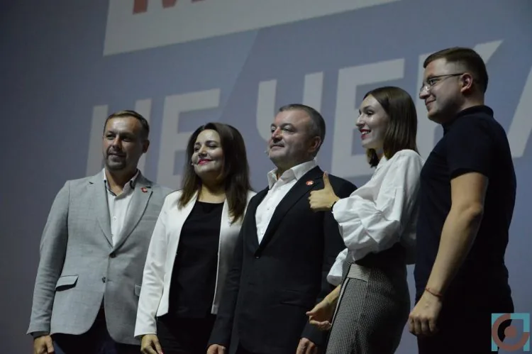З колонок його голосом звучать фрази про місто щасливих людей, місцеву команду (з наголосом на «місцеву») і вибори 25-го жовтня. Не вслухаюсь. Відволікаюся на школярів, які штовхаються біля одного з червоних наметів з логотипом «Свідомих» та підлітком, що тримає в руках оберемок партійних газет. Таких наметів на площі перед РЦ аж шість. Перехожим роздають білі брендовані кульки та пропонують світлину біля «свідомої» фотозони. Спершу охочих небагато. Промова з колонок звучить занадто голосно, люди з газетами, що стоять біля них, наполегливо продовжують посміхатись і пропонувати пресу перехожим.