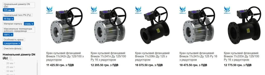 Кран з такими ж характеристиками, з редуктором, але іншого виробника в одному з інтернет магазинів коштує від 11,4 до 18,5 тисяч гривень, це підтвердили й у коментарі. Ба більше – при купівлі декількох позицій можуть діяти й знижки. Тобто навіть якщо порахувати за середньою ціною 16 тисяч, то 8 штук вартують 128 тисяч гривень із ПДВ – це удвічі менше, аніж в кошторисі підрядника.