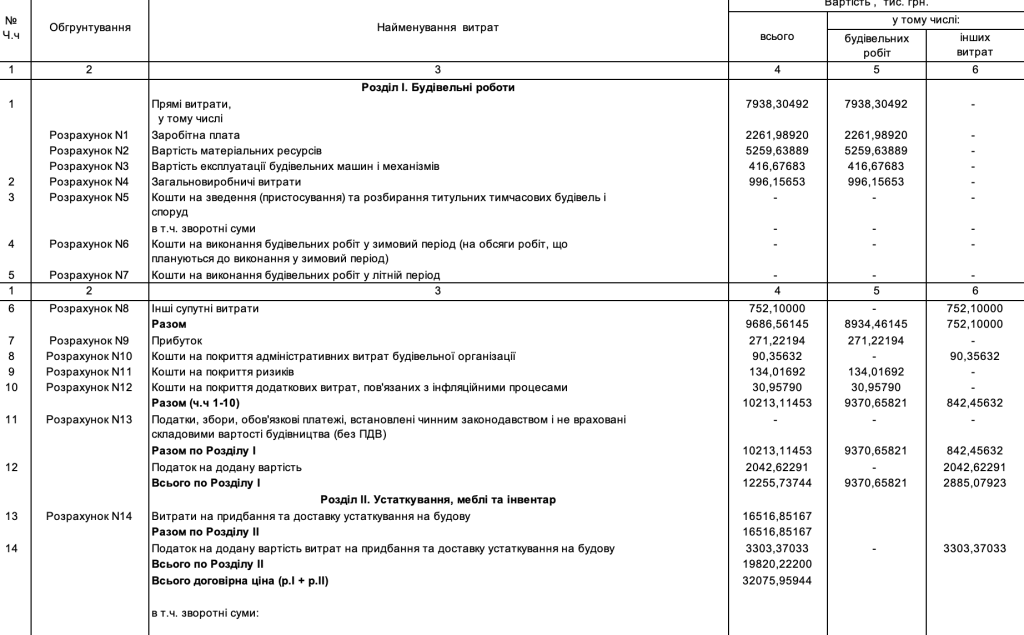 У документах сказано, що підрядник обрахував свої прямі витрати на рівні майже 8 мільйонів гривень. На зарплату піде майже 2,3 мільйона, на будівельні матеріали – майже 5,3 мільйона гривень, а на придбання та доставку необдхідного устаткування – 16,5 мільйона гривень.