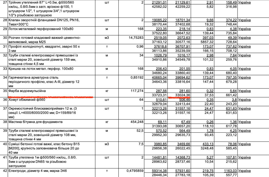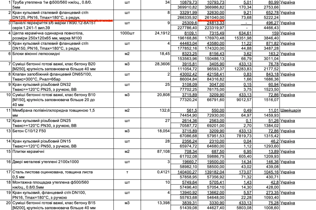 Згідно з кошторисом, сталевий кульовий фланцевий кран (ст/п DN125, PN16, Tmax=180°C) підрядник вказує за ціною в понад 32,6 тисячі гривень за одиницю, загалом 8 штук обійдеться в 261 тисячу гривень із ПДВ.