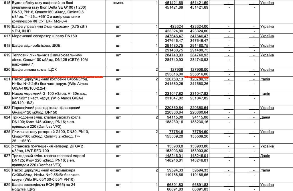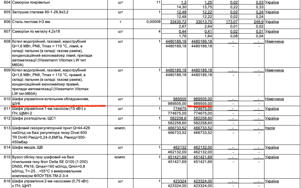 Аналізуючи ціни далі, знаходимо вартість у 989,5 тисячі гривень за шафу управління котельним обладнанням виробництва Німеччини. Ціни в інтернеті на таку техніку українського виробника у межах сотні тисяч гривень.