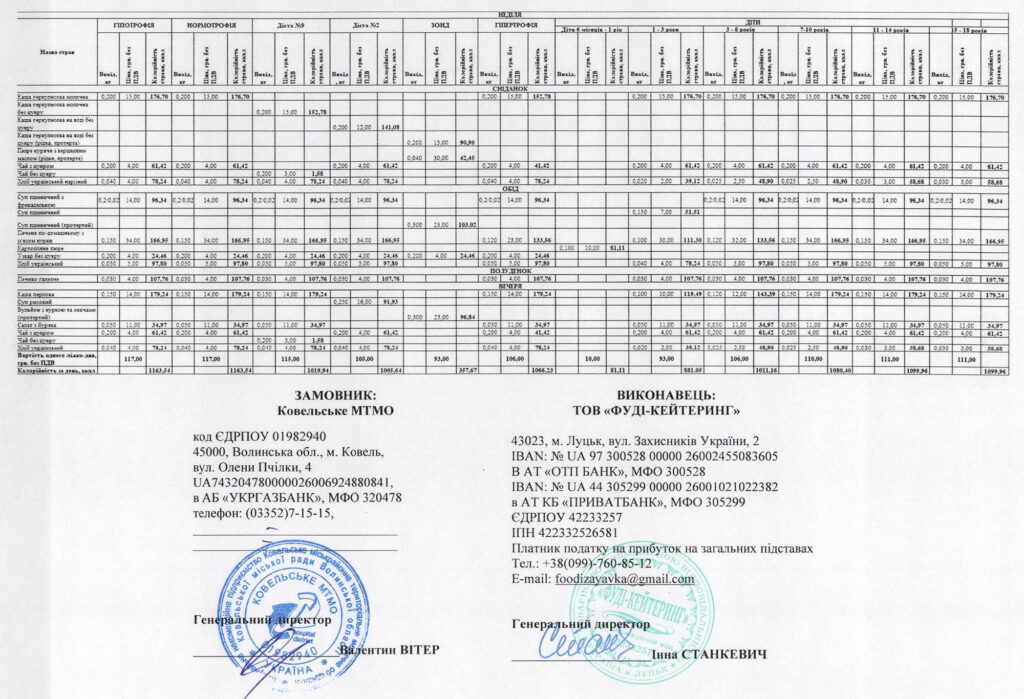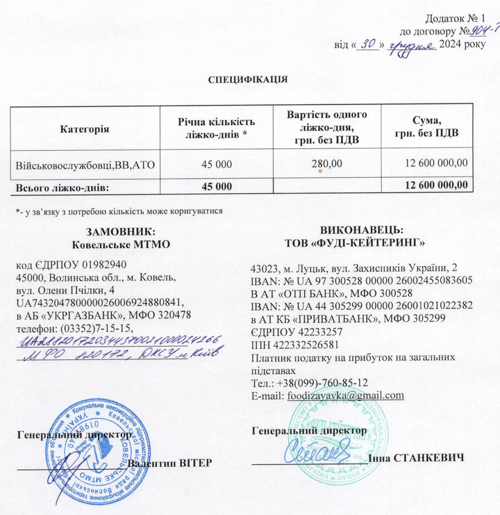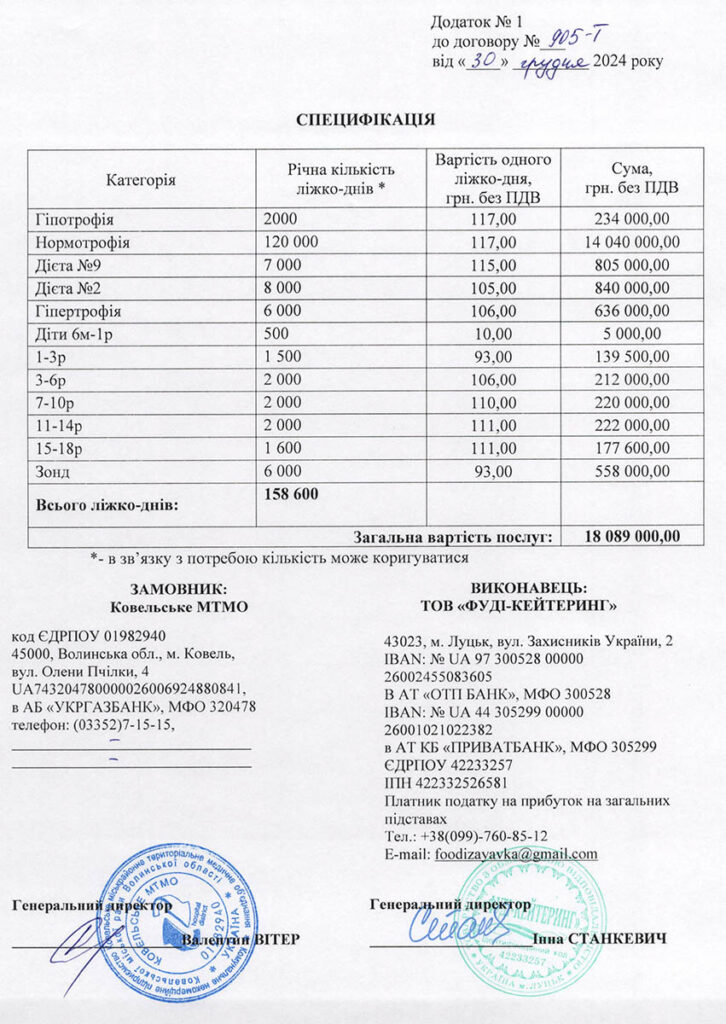 Обидва тендери оголосили 5 грудня 2024 року. Сумарна очікувана вартість закупівель становила 32 мільйони 260 тисяч гривень. Тоді ж як фактичну ціну єдиний учасник і, логічно ж, переможець обох торгів, трохи «спустив» і за свої послуги візьме з Ковельського МТМО 30 мільйонів 689 тисяч гривень. Договори про це підписали із луцьким ТОВ «Фуді-Кейтеринг» 30 грудня 2024 року.