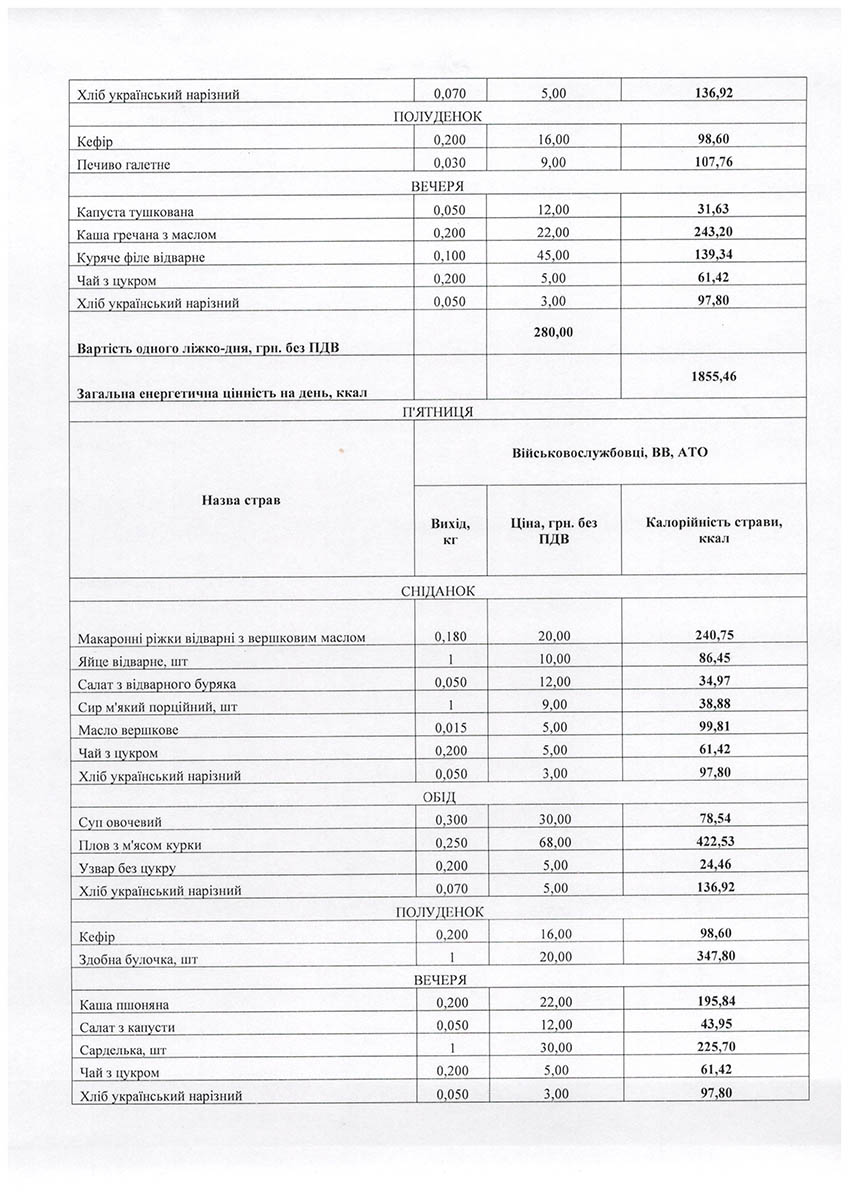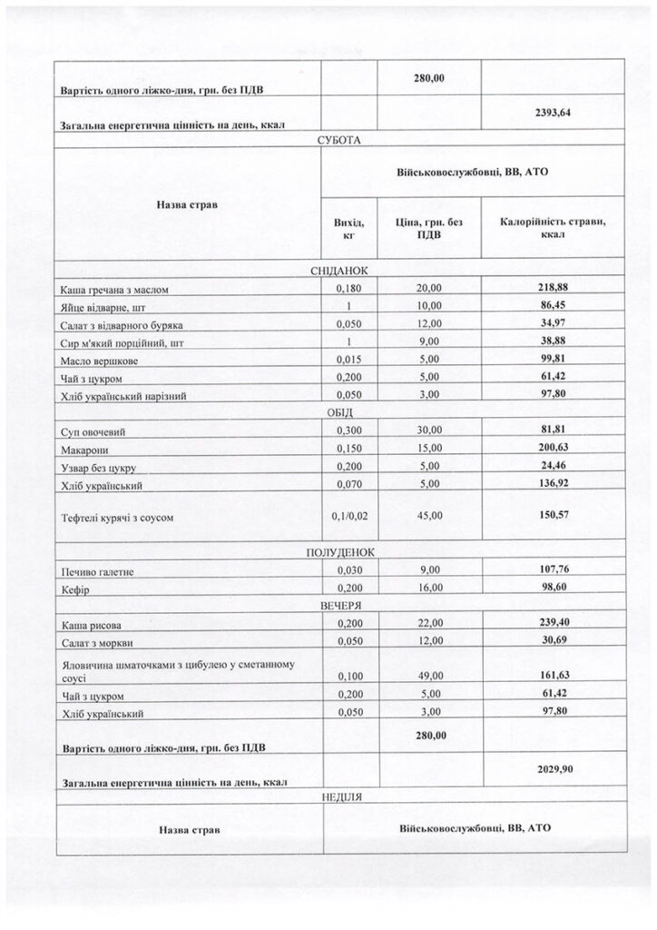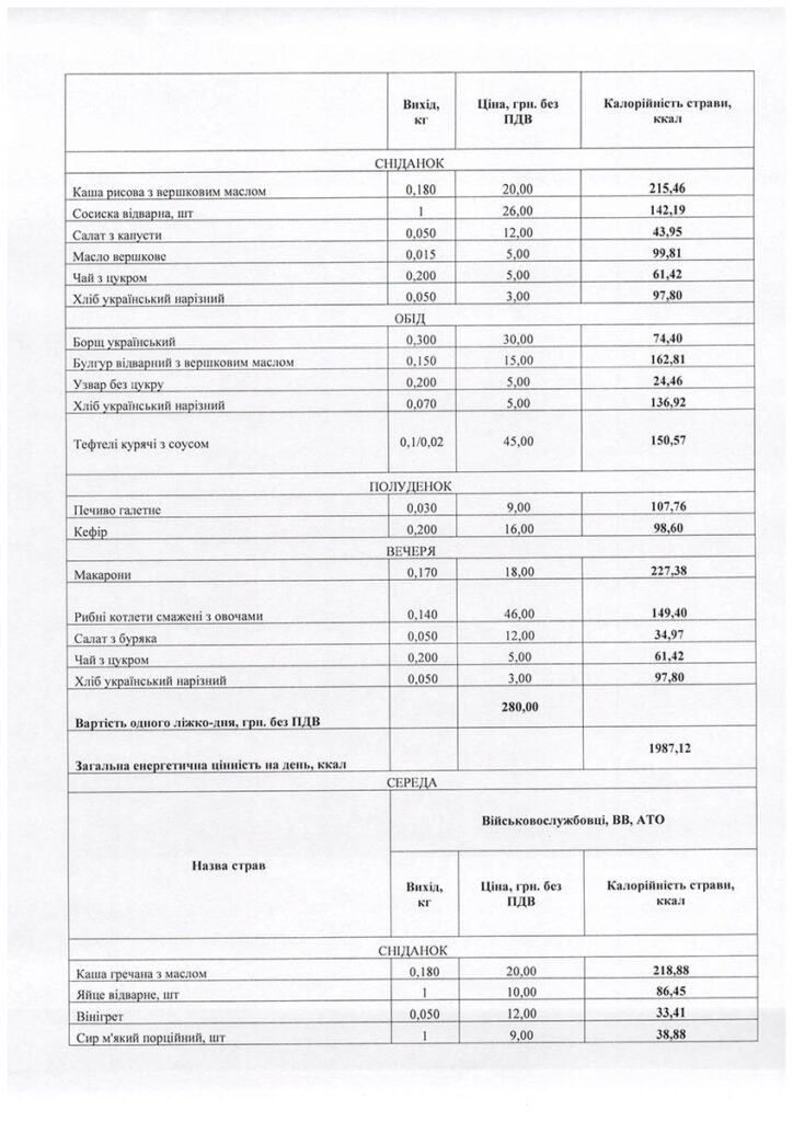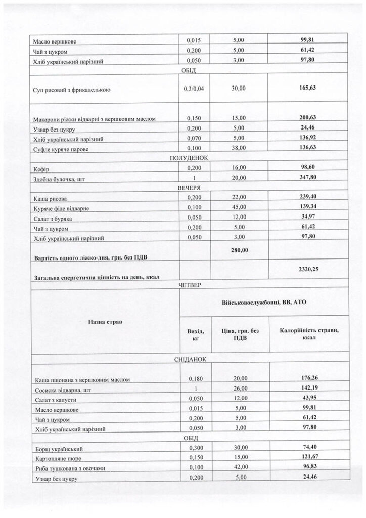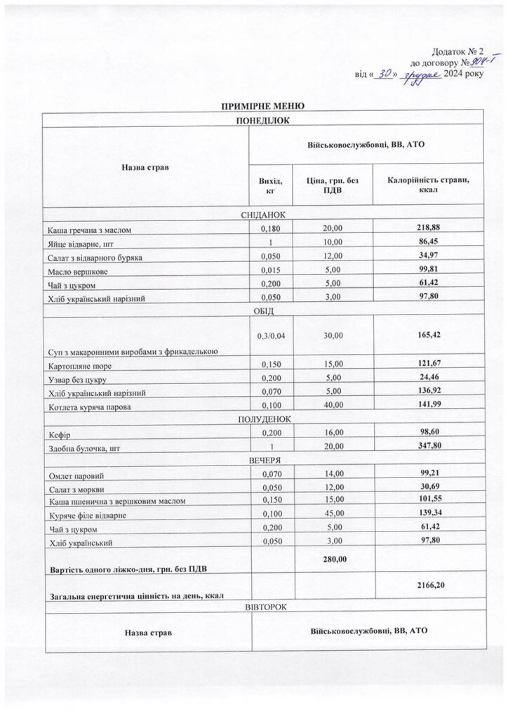 У примірне сніданкове меню для військовослужбовців на понеділок, наприклад, входить каша гречана з маслом (20 грн), відварене яйце (10 грн), буряковий салат (10 грн), а також масло, чай та хліб. Обіднє – суп з макаронами та фрикадельками (30 грн), картопляне пюре (15 грн), куряча парова котлета (40 грн), а також узвар та хліб. Полуденок включає кефір (16 грн) та здобну булочку (20 грн), вечеря – паровий омлет (14 грн), салат з моркви (12 грн), пшеничну кашу (15 грн), відварне куряче філе (45 грн), хліб та чай. В інші дні тижня меню змінюється. Детально його можна розглянути на зображеннях нижче.
