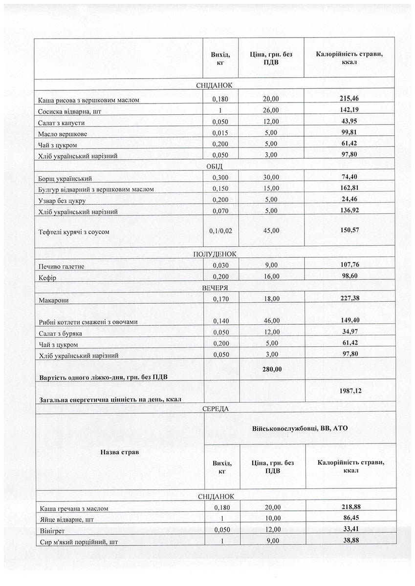 За одним із них на 12,6 мільйона гривень виконавець має впродовж року забезпечити чотириразове (сніданок, обід, полуденок та вечеря) семиденне меню для пацієнтів-військовослужбовців на 45 тисяч ліжко-днів. Вартість одного такого ліжко-дня становить 280 гривень.