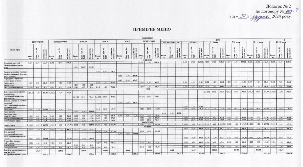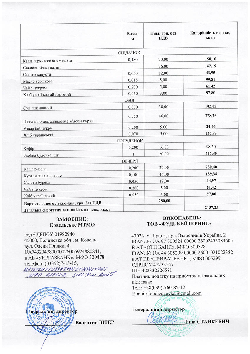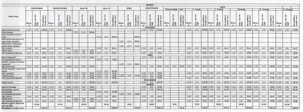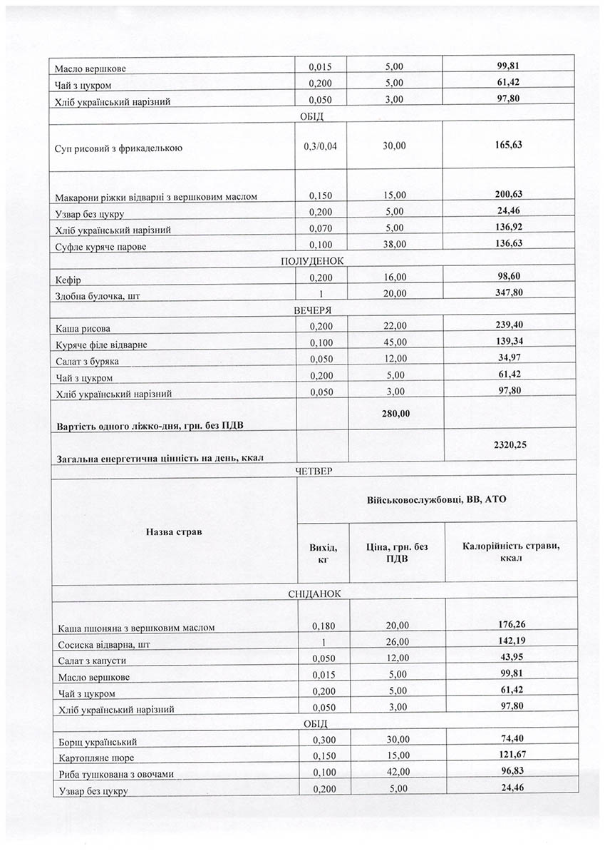 За другим договором замовили чотириразове (сніданок, обід, полуденок та вечеря) семиденне меню для інших пацієнтів медзакладу з потребами різних форм дієт на 158 тисяч 600 ліжко-днів та 18,1 мільйона гривень.
