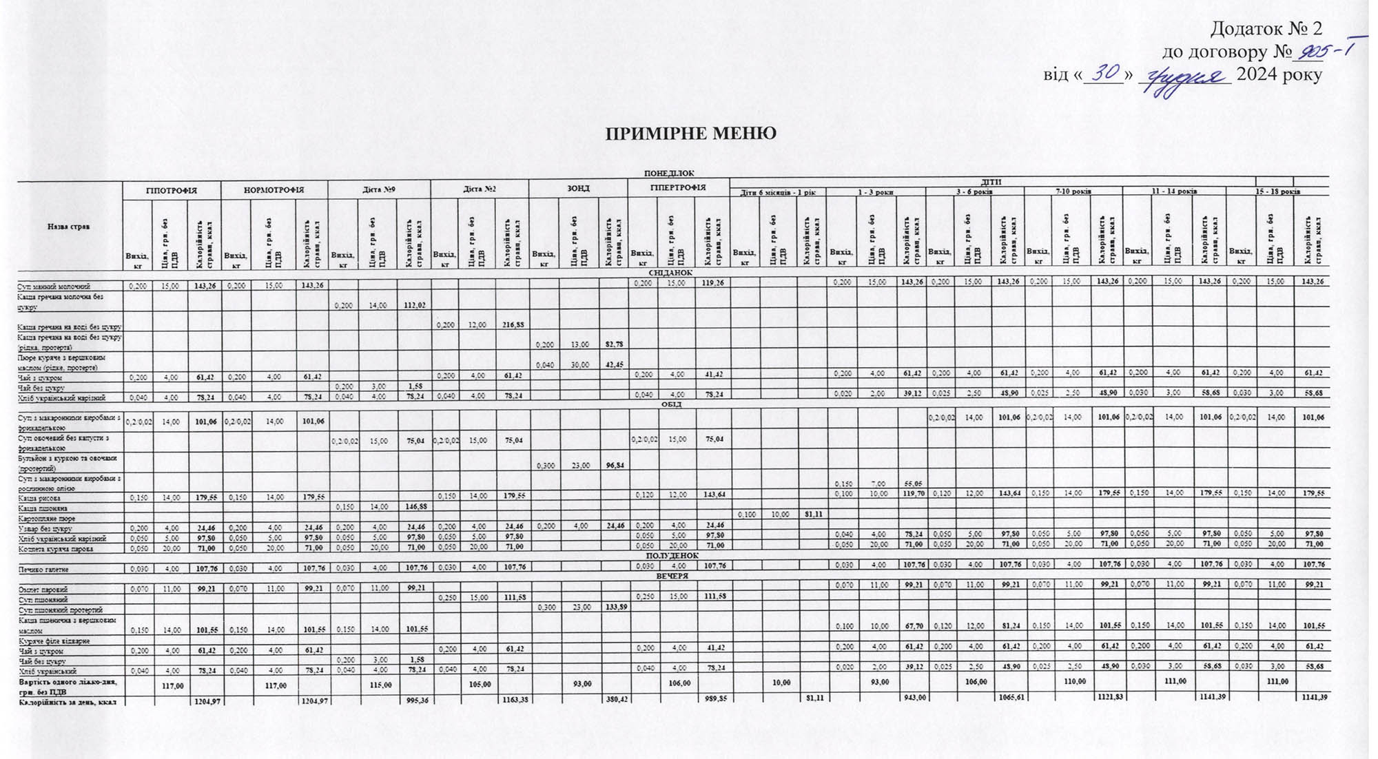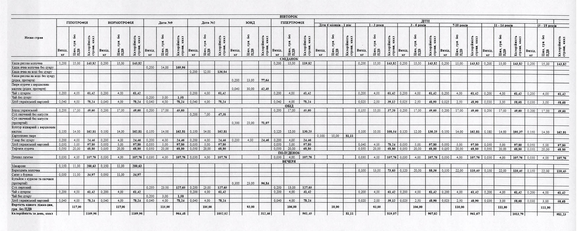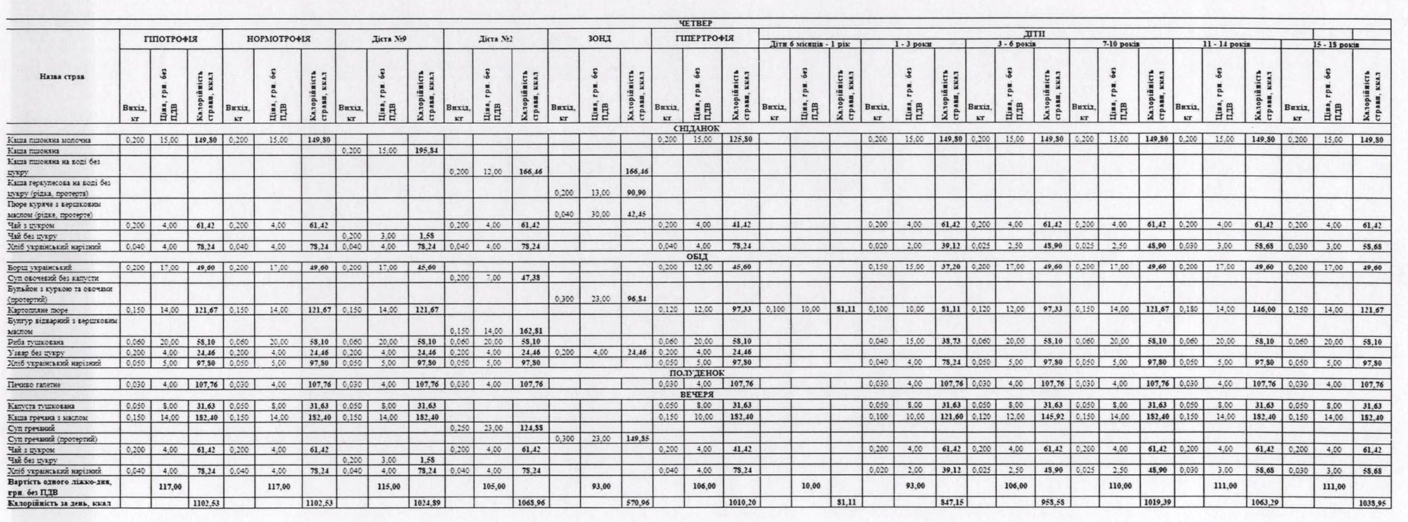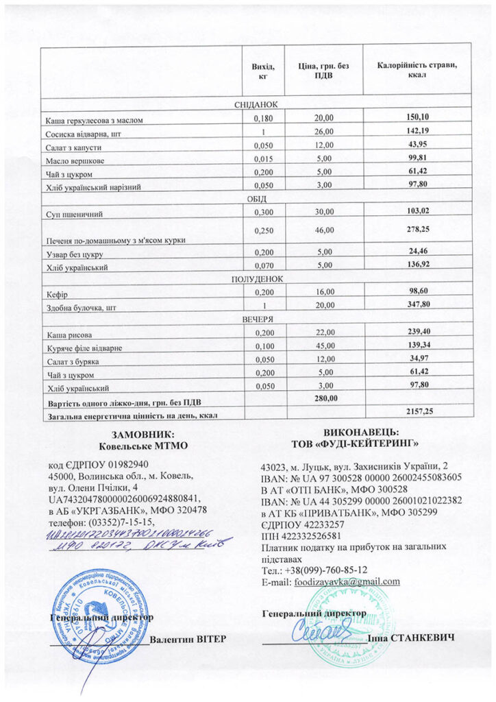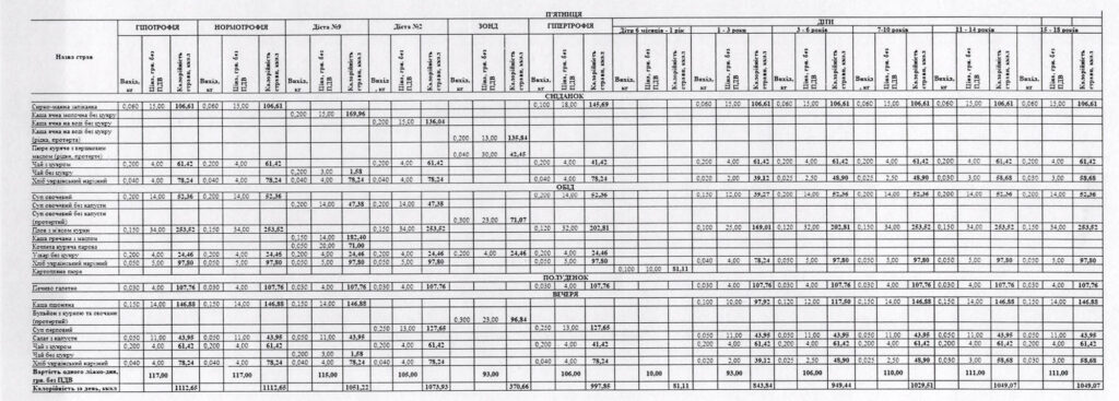 За харчовим статусом відповідно до індексу маси тіла усіх хворих поділяють на три групи: пацієнти з гіпотрофією, нормотрофією та гіпертрофією. Відповідно для групи гіпотрофії медзаклад замовив харчування на 2000 ліжко-днів, 120 000 – нормотрофії, 6000 – гіпертрофії. Також угода передбачає доставку їжі для дітей різного віку, що лікуватиметься у лікарні, на 9600 ліжко-днів. Вартість одного ліжко-дня для різних груп відрізняється і становить від 10 до 117 гривень.