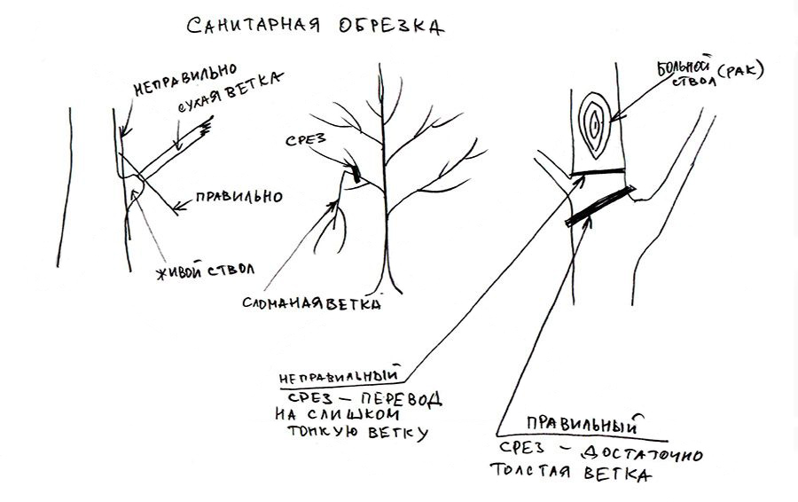 «9.1.11.2. Санітарне обрізання крони виконують, щоб позбутися старих, хворих, сухих і пошкоджених гілок, а також гілок, спрямованих всередину крони або зближених одна з одною. Обрізанню підлягають також пагони, що відходять від центрального стовбура вгору під гострим кутом, щоб уникнути їхнього обламування. Санітарне обрізання потрібно проводити щороку протягом вегетаційного періоду. Зразу після обрізання всі рани діаметром понад 2 см зашпаровують садовою замазкою або зафарбовують олійною фарбою на натуральній оліфі під колір крон дерева».