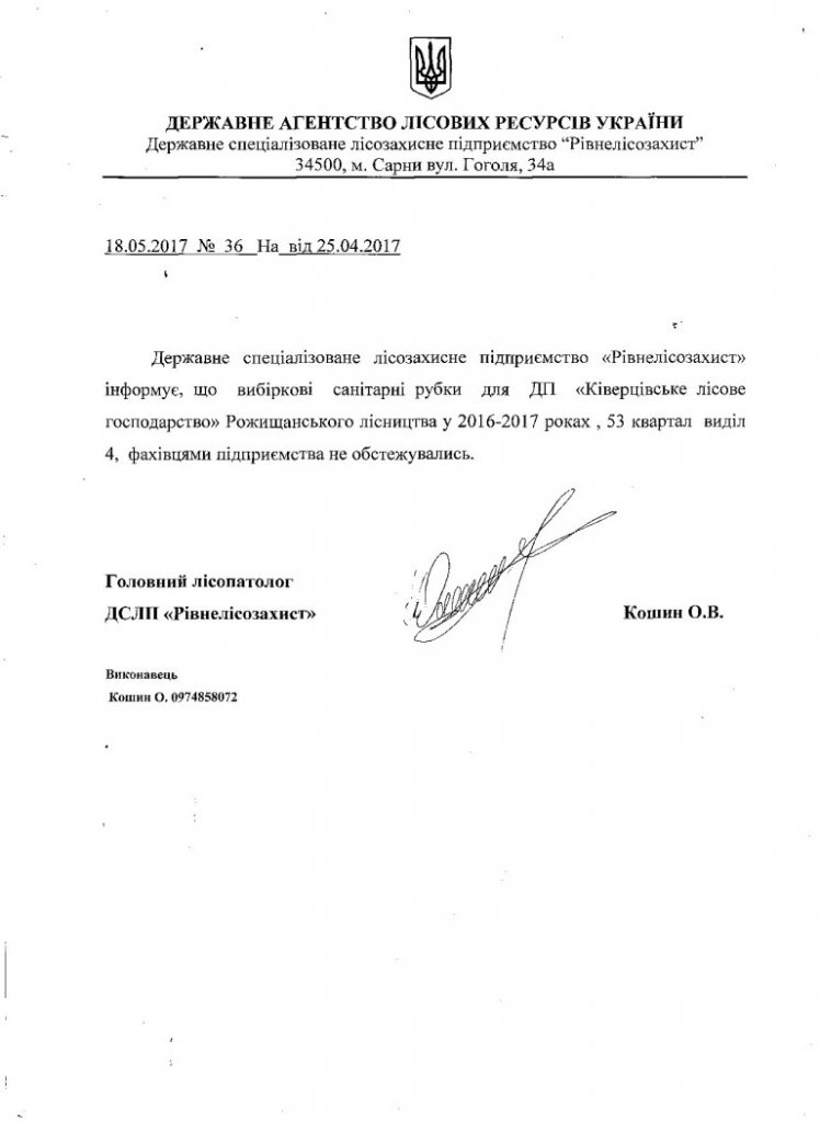 Яка ж патологія змусила лісівників вирізати майже півтори сотні дубів і ще кілька одиниць дерев інших порід? З цим питанням журналісти звернулися до державного підприємства Рвнелісозахист. Саме ця установа обстежує болячки волинських лісів і ставить діагнози. Оскільки відповіді на письмовий запит не надійшло, подолавши 200 кілометрів прибули у Сарни (саме там знаходиться ДСЛП Рівнелісозахист). Ні керівника, ні головного лісопатолога на підприємстві не було. Секретар підтвердила, що запит вони отримували і зателефонувала головному лісопатологу Олександру Кошину. «Ви що з Прокуратури, що я зобов’язаний відповідати на ваші запити?!», – обурювався держслужбовець. Однак, після ознайомлення з Законом «Про доступ до публічної інформації», відповідь все ж надали. Отже, 53 квартал Ківерцівського лісгоспу не обстежувався, ніяких погоджень лісопатолог не підписував. Можна було б подумати, що згадувану ділянку обстежували фахівці з інших лісозахисних установ. Можна… Але відсутність матеріалів відводу до лісорубного квитка не дає підстав для сумнівів.