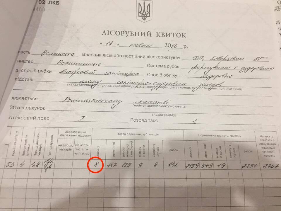 Якщо приблизно порахувати кількість кубометрів деревини у дубових колодах, які ще встигли описати в акті огляду місця події поліцейські, то тільки тут лежало близько 10 кубометрів ділової деревини дуба. Згідно лісорубного квитка на цілій ділянці ділової деревини різних сортів планувалось отримати всього 8 кубів.