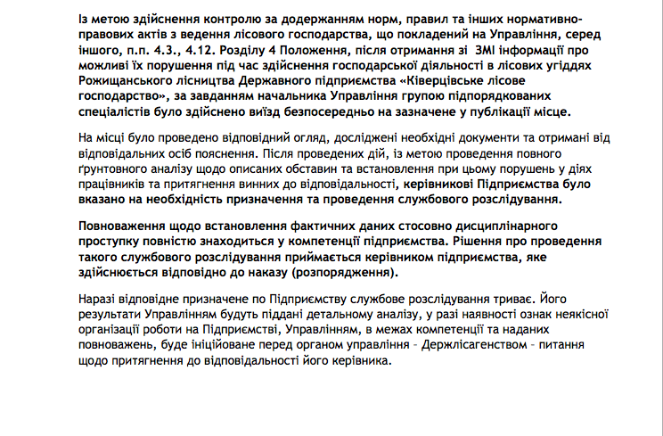 Поки на виділі працювали екологи і правоохоронці, журналісти поїхали в ДП Ківерцівське ЛГ. Керівника на місці не було. Головний інженер, лісничий Андрій Ткачук дав зрозуміти, що матеріали відводу до лісорубного квитка вони знищили. Нема документів – нема проблем…
