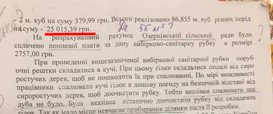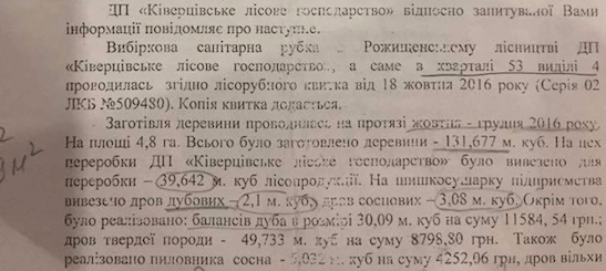 Отже, якби ж усі ці 13 кубометрів були діловою деревиною породи дуб, то коштували б вони приблизно 200 000 гривень. Натомість, у відповіді на запит начальник ДП Ківерцівське лісове господарство Анатолій Іщик пише, що майже все, що заготовили на 4 виділі 53 кварталу реалізували за 25 015 гривень!