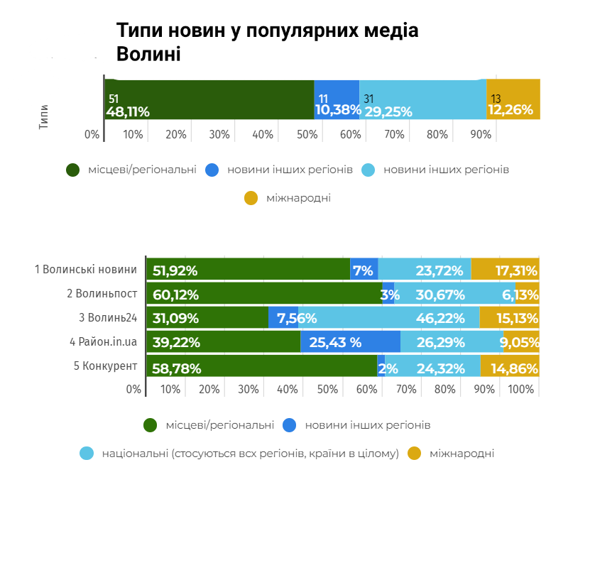 В луцькому інфопросторі онлайн-медіа тільки половина новин має місцевий контекст. Кожна третя новина — національні новини, ще 12% — міжнародні новини, кожна десята, або 11 % — новини з інших регіонів України. Якщо у всеукраїнських новинах, опублікованих в онлайн-медіа, темою №1 є російсько-українська війна, то у сегменті місцевих новин переважають негативні повідомлення про аварії та інші надзвичайні ситуації – майже 50% місцевих новин, по суті, кожна друга, стосувались ДТП, криміналу та надзвичайних ситуацій.