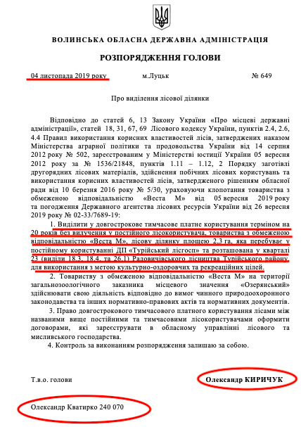 Нагадаємо, 12 травня на сайті Волинської ОДА оприлюднили розпорядження очільника виконавчої влади області Юрія Погуляйка про виділення на 20 років лісової ділянки в загальнозоологічному заказнику «Озерянський» фірмі «Веста М». Документ підписаний 8 травня.