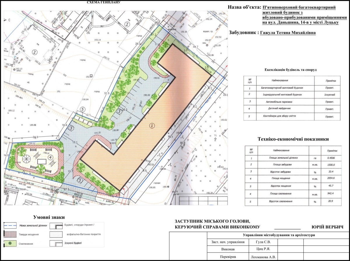 На початку серпня в управлінні архітектури та містобудування Луцька Тетяні Гажулі видали містобудівні умови та обмеження. Однак, аж ніяк не для зведення багатоповерхівки, а на зведення індивідуального житлового будинку. Очевидно, розуміли незаконність рішення виконкому. В документі вказано, що саме таке будівництво відповідає генплану і повинно бути не вище 13,5 метрів.