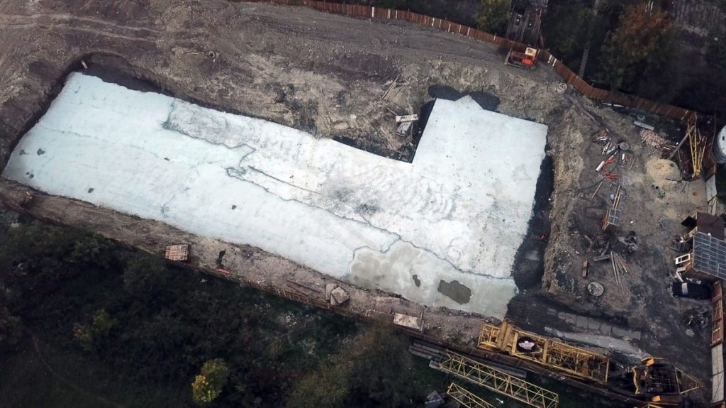 За кілька днів на ділянці вже й розгорнулося саме будівництво. Як вам масштаби хатинки? На фото зроблених 6-го жовтня видно котлован, залитий фундамент, будівельну техніку та кран.