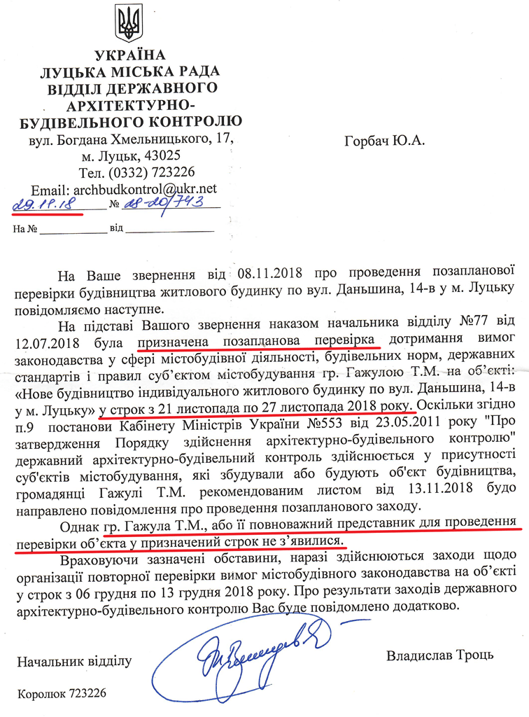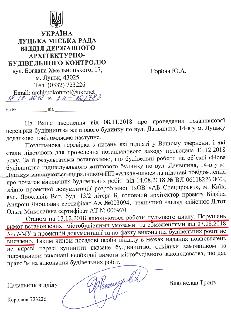 Ще на початку листопада минулого року Центр журналістських розслідувань «Сила правди» звернувся до відділу державного архітектурно-будівельного контролю в Луцькраді щодо проведення перевірки на будівництві на Даньшина, 14-в. Протягом місяця посадовці не могли провести перевірку, бо, мовляв, забудовник не з’являвся. Лише 13 грудня посадовці врешті її провели.