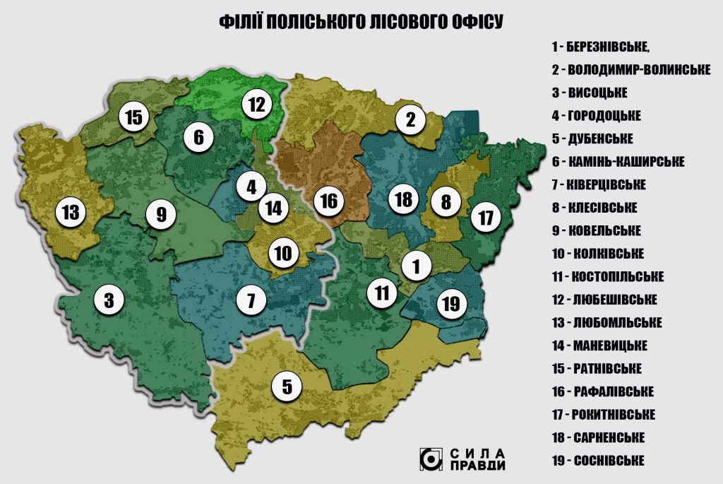 Зокрема на основі Волинського та Рівненського обласних управлінь лісового та мисливського господарства створили Поліський лісовий офіс, який координує роботу 19 філій: Березнівської, Володимир-Волинської, Висоцької, Городоцької, Дубенської, Ковельської, Камінь-Каширської, Ківерцівської, Колківської, Клесівської, Костопільської, Любомльської, Любешівської, Маневицької, Ратнівської, Рафалівської, Рокитнівської, Сарненської, Соснівської. Із них – десять волинських, створених на основі колишніх лісгоспів.
