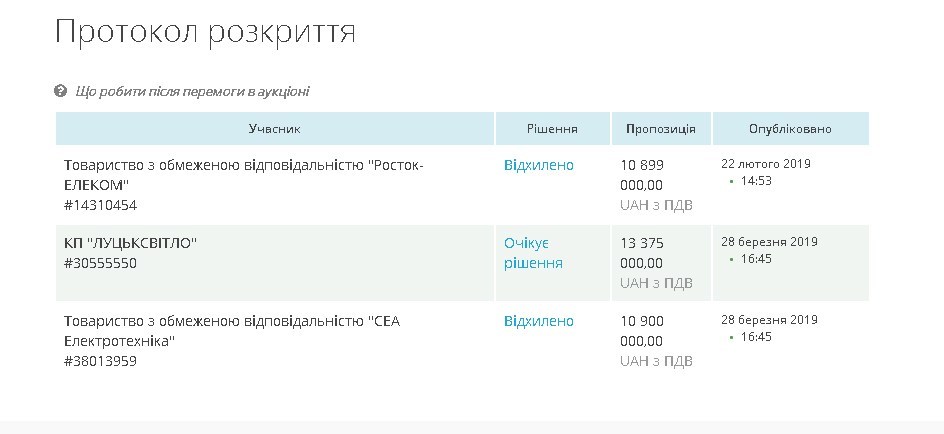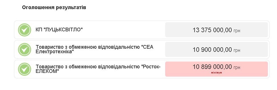 Під час проведення аукціону пропозиція комунального підприємства знизилась лише на 1700 гривень. В той час як конкуренти знизили ціну на понад 2 мільйони гривень. Тож переможцем аукціону стала найдешевша пропозиція ТзОВ «Росток –ЕЛЕКОМ» – 10 899 000 гривень.