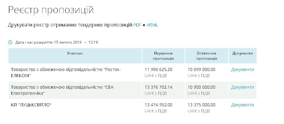 На конкурс надійшло три пропозиції, найдорожчою з яких виявилась пропозиція комунального підприємства «Луцьксвітло». Дві дешевші пропозиції надали київські підприємства: