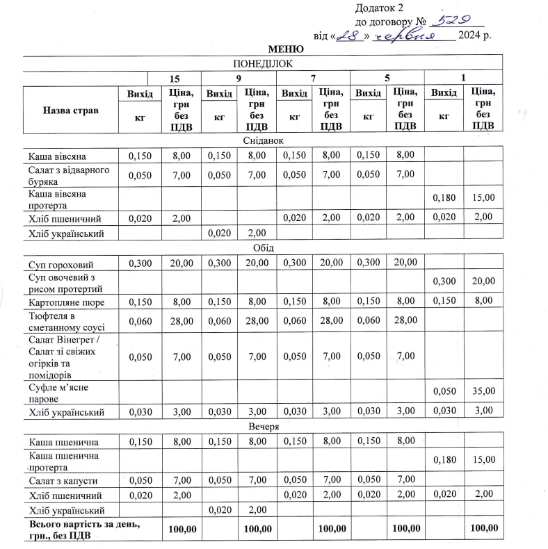 На торги зареєструвався один учасник – товариство з обмеженою відповідальністю «Фуді-кейтеринг» з Луцька. 28 червня 2024-го року лікарня уклала з ним договір за цією ж ціною терміном на один рік. Відтак триразове харчування одного пацієнта вартуватиме сумарно 100 гривень.