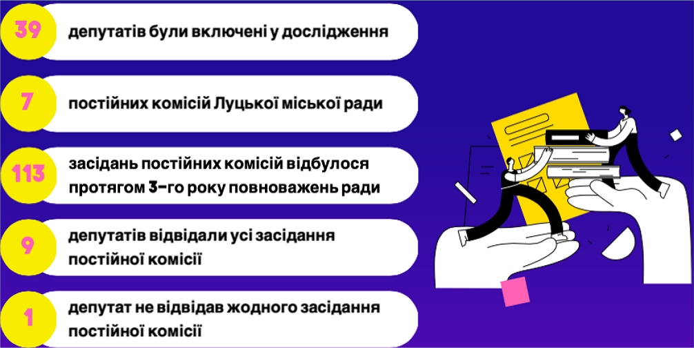 Діяльність обранців Луцької міської ради досліджувалася у період з 27 листопада 2022 року до 27 листопада 2023 року. Вивчалася їх присутність на засіданнях 7 постійних депутатських комісій, до складу яких вони входили. З-поміж 39 депутатів, які були включені у дослідження, лише дев’ятеро відвідали усі засідання своєї профільної комісії.