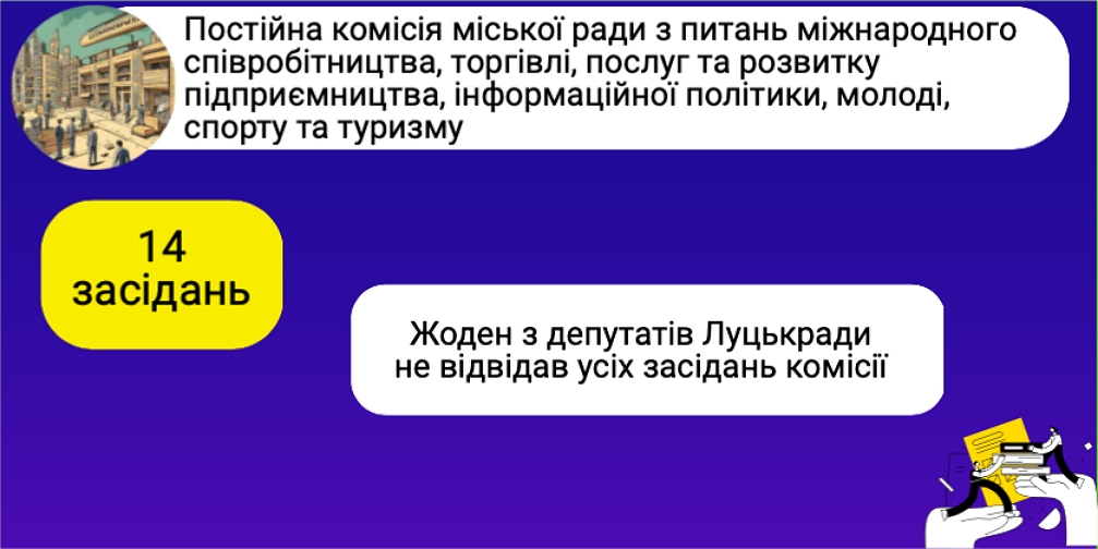 За рік роботи лише 9 депутатів Луцької міськради відвідали усі засідання своїх постійних комісій. Найактивніше обранці ходили на засідання комісії з питань комунального майна та приватизації, а також розглядали земельні питання. Натомість комісію з міжнародного співробітництва та розвитку підприємництва повністю не відвідав жоден з депутатів.