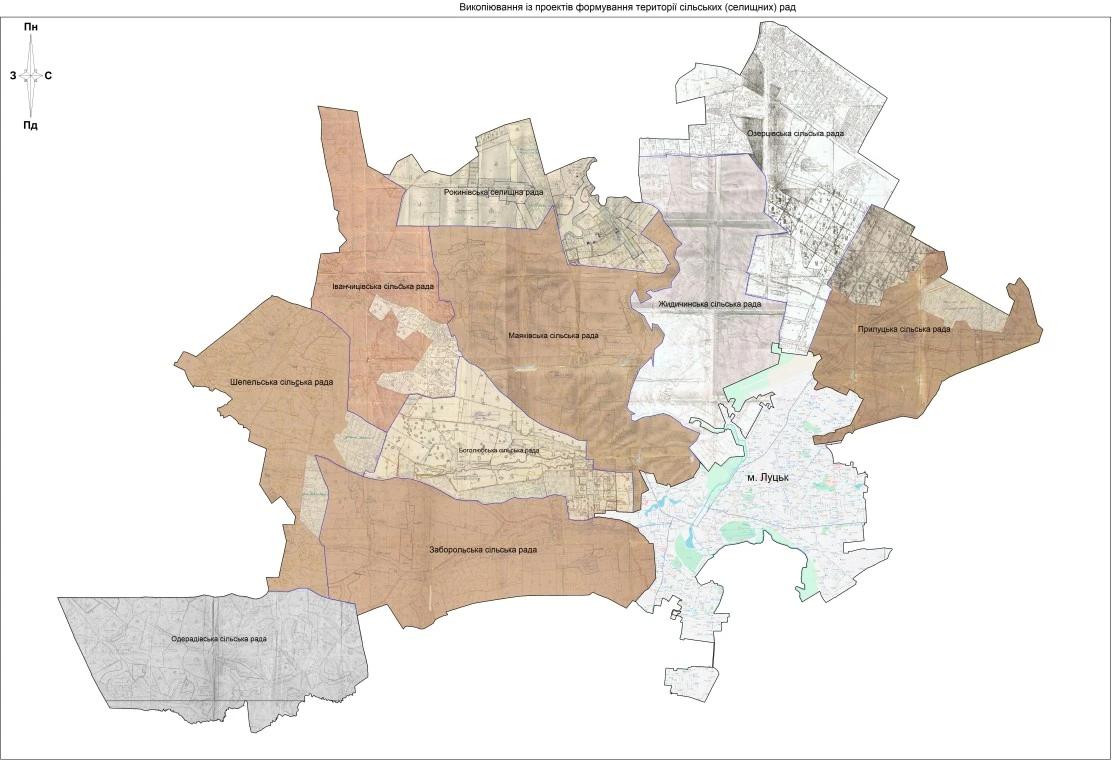 «При формування проекту встановлення меж території Луцької міської територіальної громади Луцького району Волинської області використані копії матеріалів з Державного фонду документації із землеустрою, а саме картографічні матеріали проектів формування території та встановлення меж Боголюбської, Жидичинської, Заборольської, Іванчицівської, Маяківської, Одерадівської, Озерцівської, Прилуцької, Рокинівської, Шепельської сільських рад Луцького району Волинської області», – йдеться в документації фірми-розробника «Лекстатус груп».