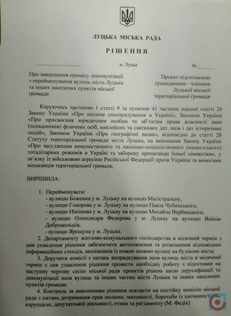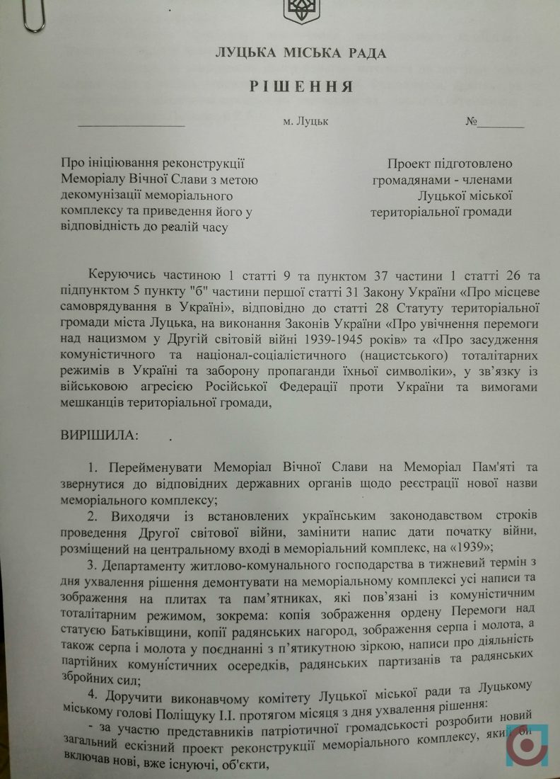 Працівники засобів масової інформації Луцька вимагають активізувати процес декомунізації. Задля цього журналісти розробили для депутатів міської ради два проєкти рішень. Йдеться про перейменування та реконструкцію Меморіалу Вічної Слави, який досі містить багато радянських символів, та низки вулиць.